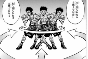 右へ回られたら右構えで対応し、左に回られたら左構えへ切り替える技。軸足の移動がないので通常ではあり得ないほど速く相手を捉えることができる。相手目線どこにいても睨みつけられているようで、この技ゆえにランディは「阿修羅」と称されるようになった。