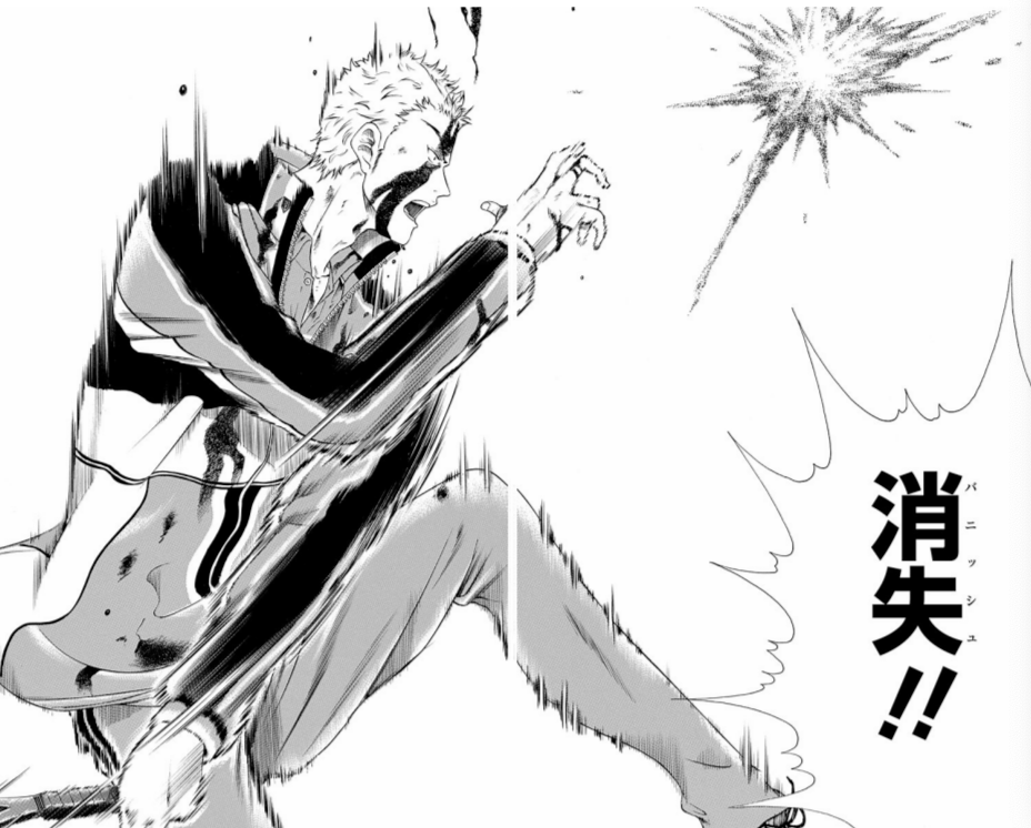バウンド時のスピンで土煙を発生させ、急激に打球が跳ね上がってくるショット。金太郎は対応できず顔面に直撃してた。土煙を消せば視認できるようになるので、金太郎は...
