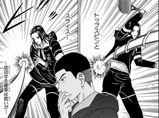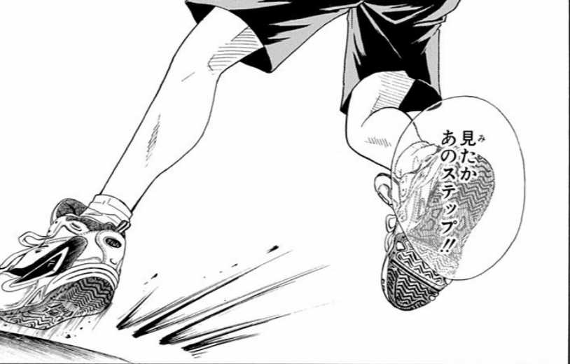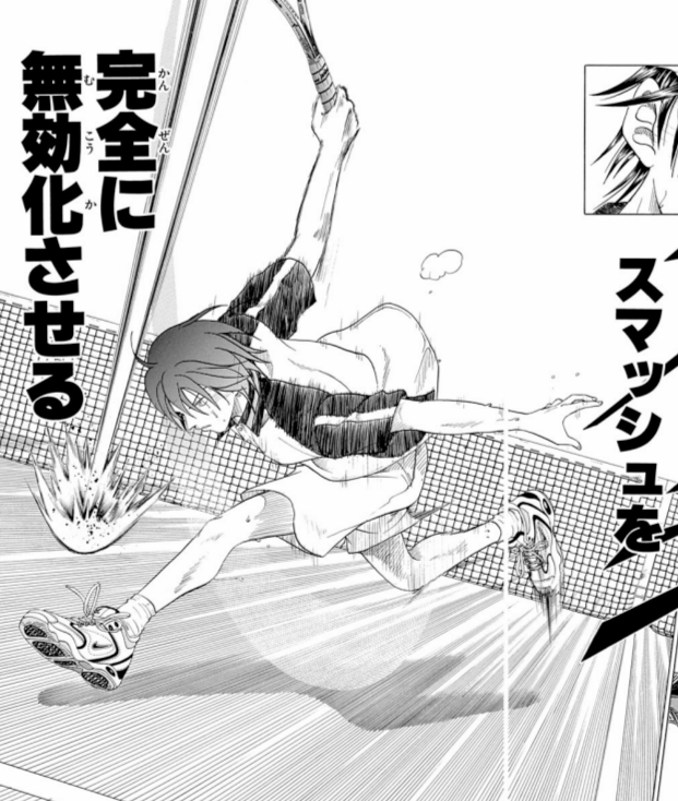 使用者は越前リョーマ、切原赤也。片足でのスプリットステップ。片足で着地することで通常よりも一歩半早く動くことができる。また、逆方向への切り返しをノーモーションで行える。ただ、動く方向と逆の足で着地してしまうと逆に大幅のロスになるので、跳... -