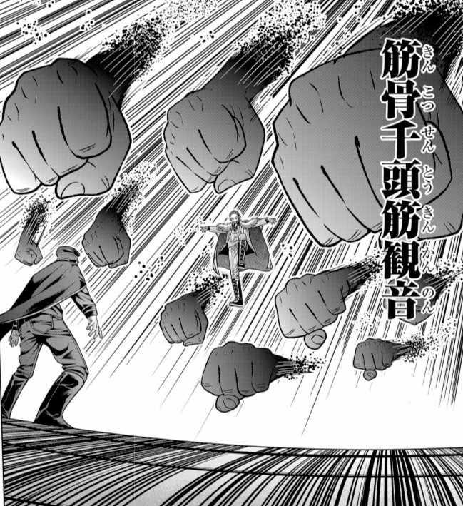 概要 桃舵壱郎の能力。細菌で最大千本もの腕を造り出し攻撃していく。筋トレした分だけ強度の高い腕となり、筋トレ不足だと細い腕しか造ることができない。威力は高く、百目鬼が「潰されたら即終了」と評するほど。 技 筋骨千頭筋観音・崩腕 無数の腕を合...