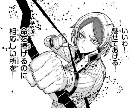 桃脇岼の能力。細菌で弓矢を作り出し、物質の中を移動する矢を放てる。壁・地面・天井全方位からの攻撃が可能だが、人体を通過することはできないのが弱点。ただ、出てくる瞬間を目で追うことはできるので、ネタさえ割れてしまえば回避は可能。桃脇から離... -