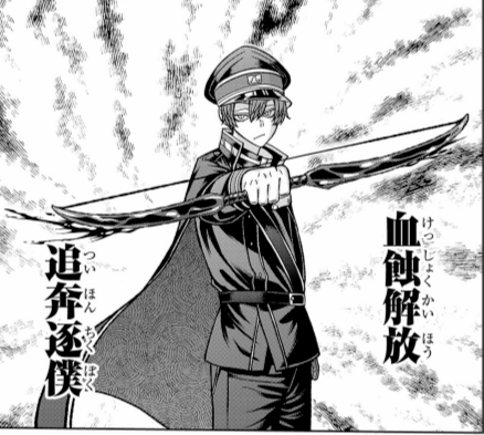 囲岬の血触解放。血で弓矢を作り出し、追尾する矢を放つことができる。矢は同時に6本生み出せる。一度出した弓矢は囲の意思で消さない限り残り続ける。矢には微弱な神経毒が含まれており、喰らうと数分は動きが鈍くなる。また、ロープ状に変形させた矢で命... -