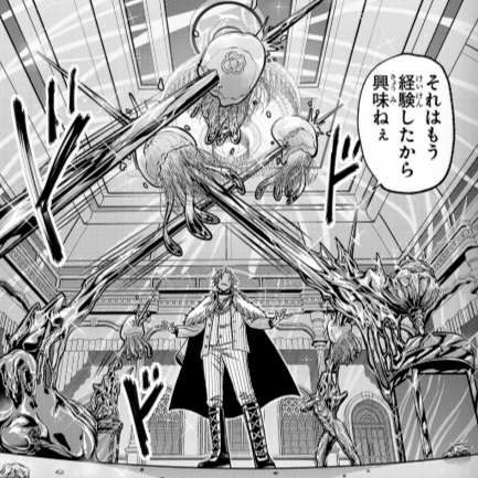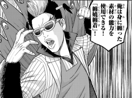 桃間纏の能力。身に纏った素材の能力を使用できる。動物の素材でできた衣服を纏うことで、その動物の特性を発揮できる。ゴリラの毛皮のアームカバーで腕力の強化、サイの皮のシャツで防御力の強化、ヒョウの皮のズボンと靴で俊敏性強化、ハヤブサの羽根飾... -